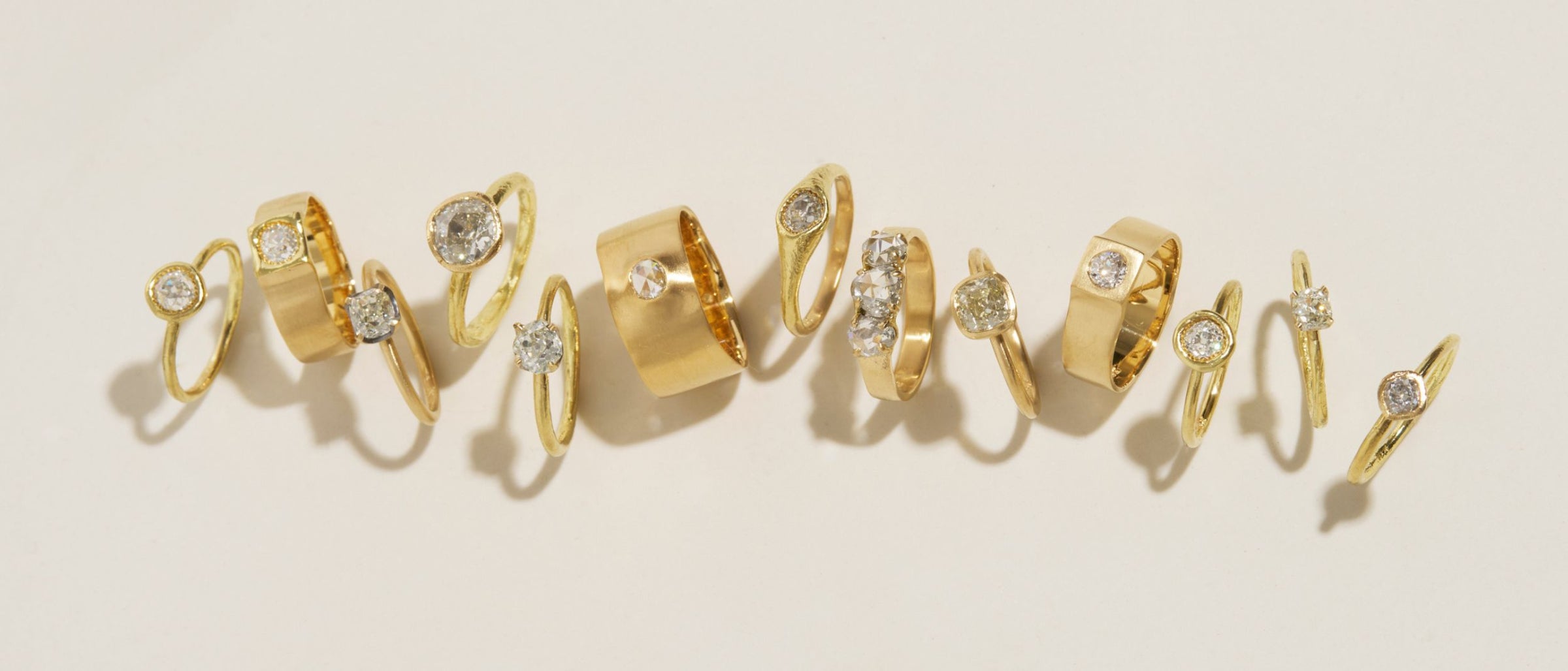 This collection features diamonds cut in historic styles such as Old Mine Cut, Old European Cut, and Rose Cut—cutting traditions developed before the standardization of modern brilliance.