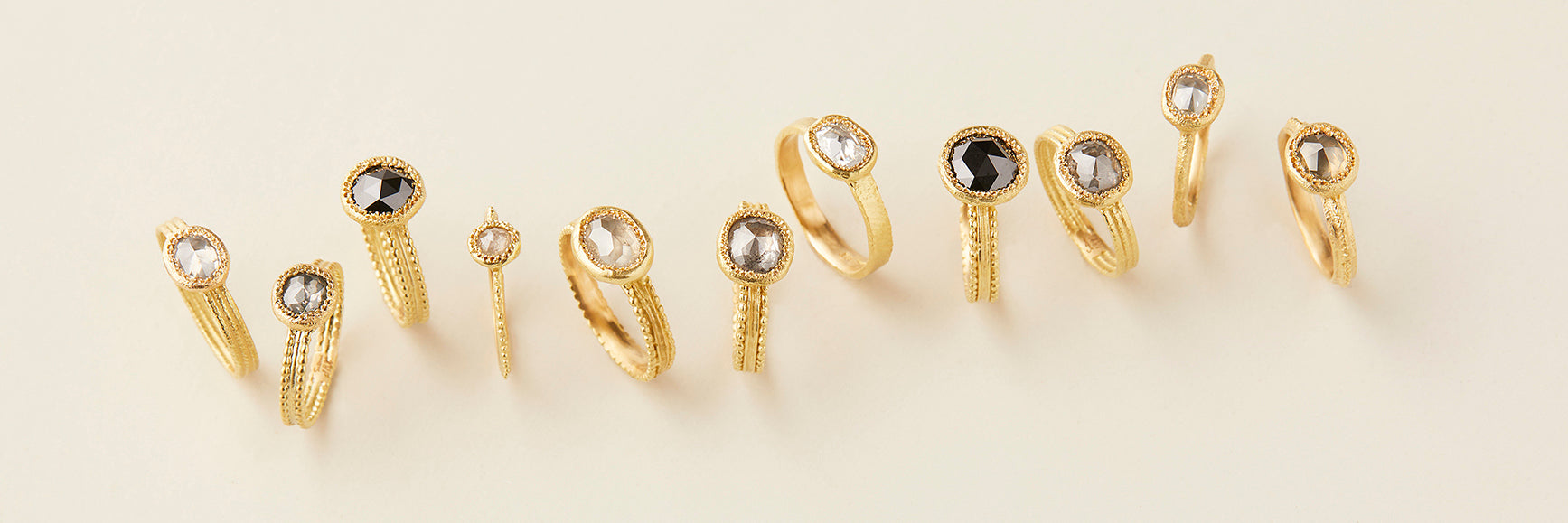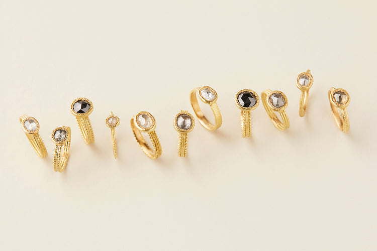 Having celebrated the milestone of our Tribeca studio/showroom's 10th anniversary, Satomi created a collection inspired by those early days. Rich in texture and primitive touches, each piece reflects her distinctive style with subtle distortions and imperfections that enhance their charm, evoking the warmth of handcrafted artistry. The carefully selected oval and round rose-cut diamonds, known for their individuality in cut, color, and shape, captivate with their unique beauty.