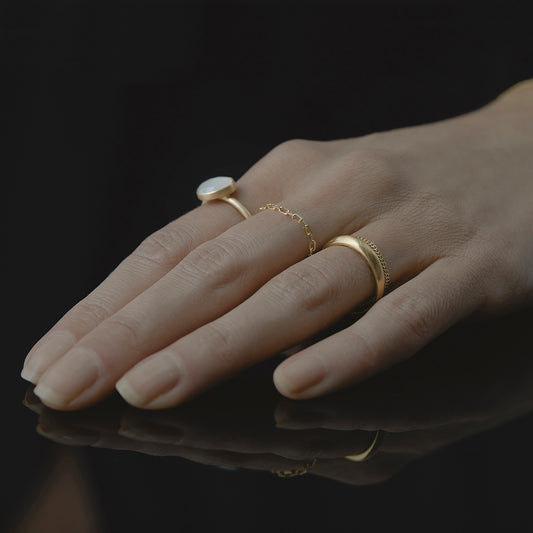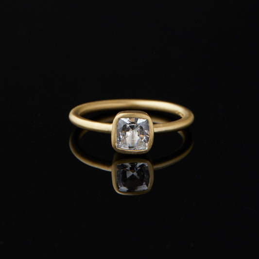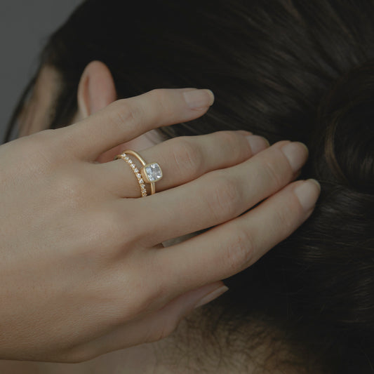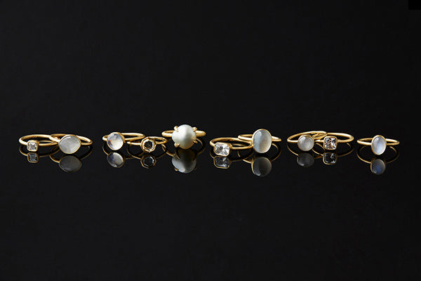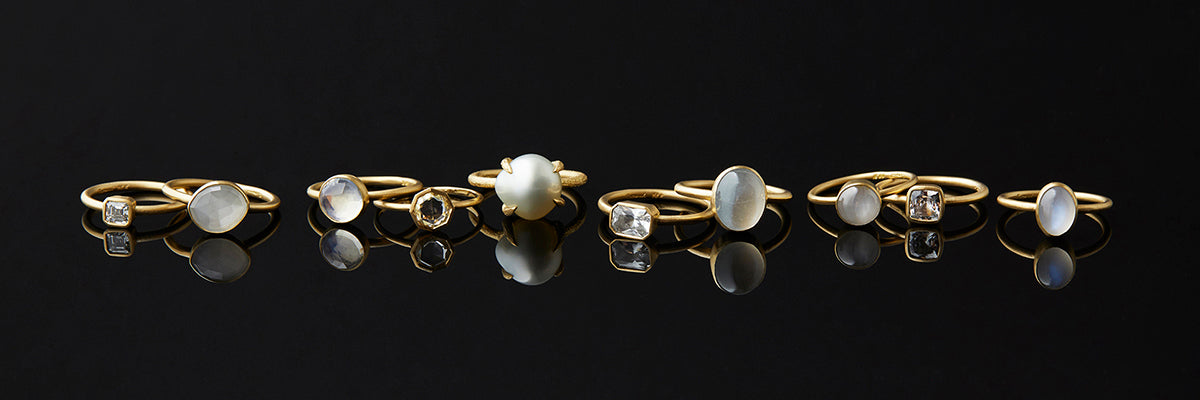Inspired by the crisp white, snowy wonderland of winter, Satomi thoughtfully selected stones for 10 unique solitaire rings. Pairing rich, textured 18K yellow gold with a variety of settings that showcase the natural beauty of its center stone, each piece glitters and glows like winter held in time.