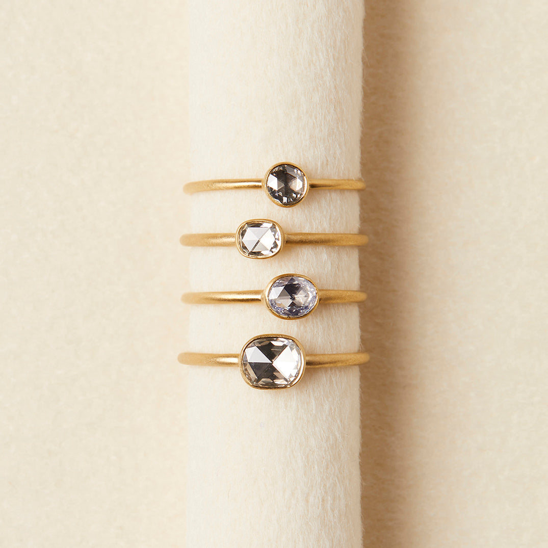 The rose cut is one of the most unique and breathtaking - with its origins dating back to the 16th century, it was inspired by the spiral of petals in a rose bud and features a flat bottom and domed top made up of triangular facets. Satomi searched high and low for these special stones in a variety of shapes, sizes and colors. Each delicate ring will take your breath away with its captivating beauty.