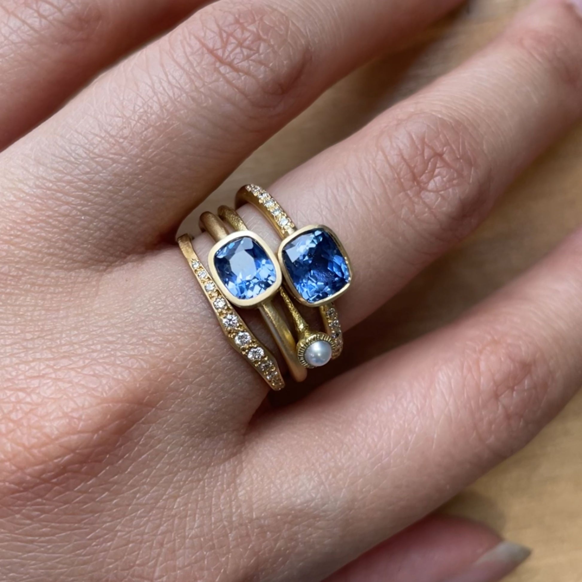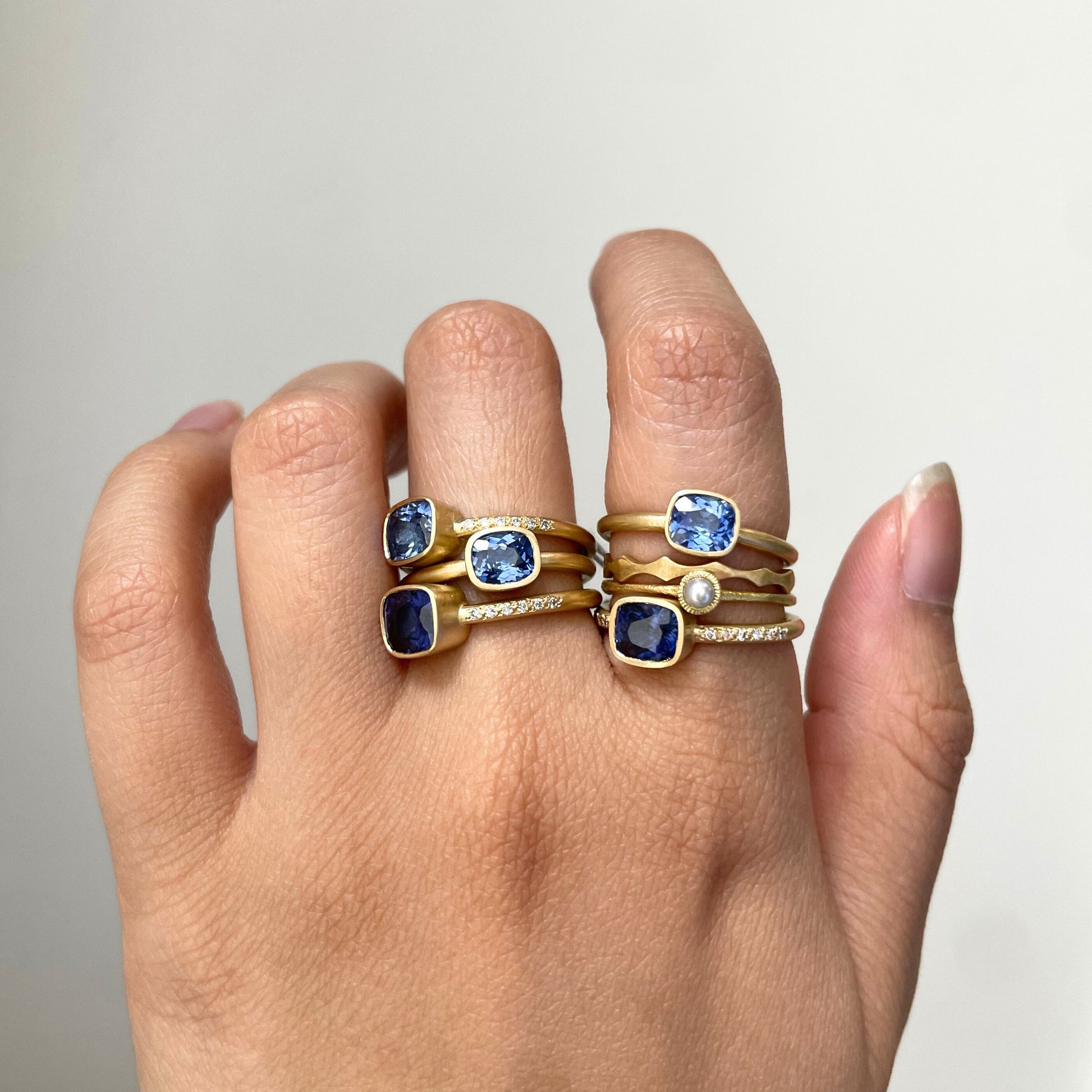 These One-of-a-Kind cushion-cut blue sapphires were handpicked by Satomi for their soft, rounded corners and brilliant facets, which enhance the stone's natural depth and vibrant color. Set in our classic bezel setting and adorned with white diamond melee, this design brings out the sapphire's rich blue hue, making every facet shimmer with timeless beauty.