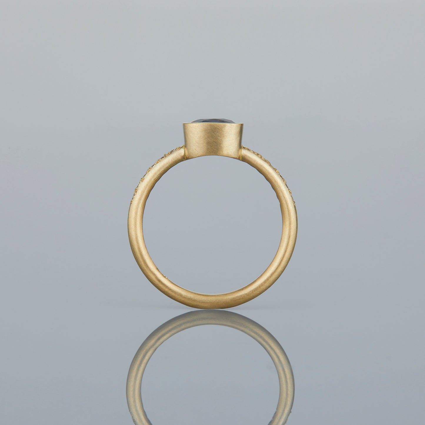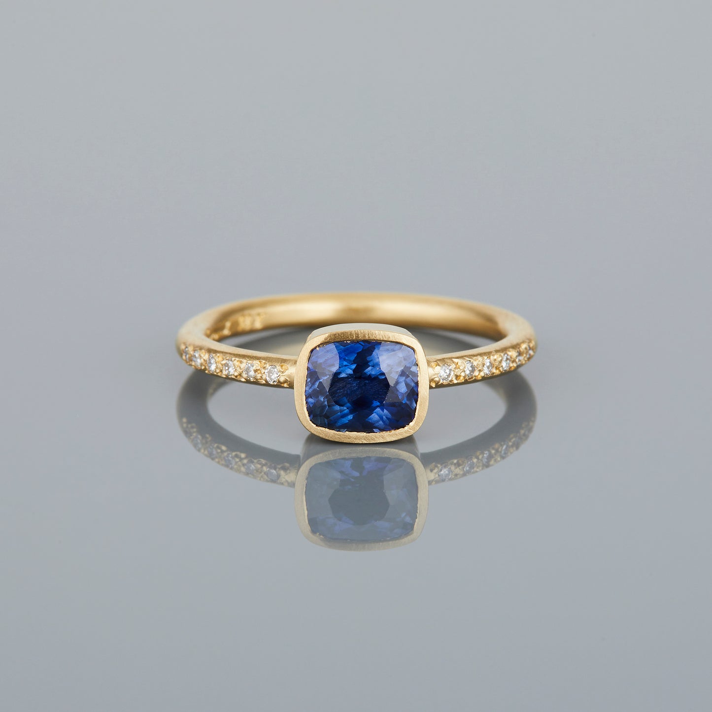 These One-of-a-Kind cushion-cut blue sapphires were handpicked by Satomi for their soft, rounded corners and brilliant facets, which enhance the stone's natural depth and vibrant color. Set in our classic bezel setting and adorned with white diamond melee, this design brings out the sapphire's rich blue hue, making every facet shimmer with timeless beauty.