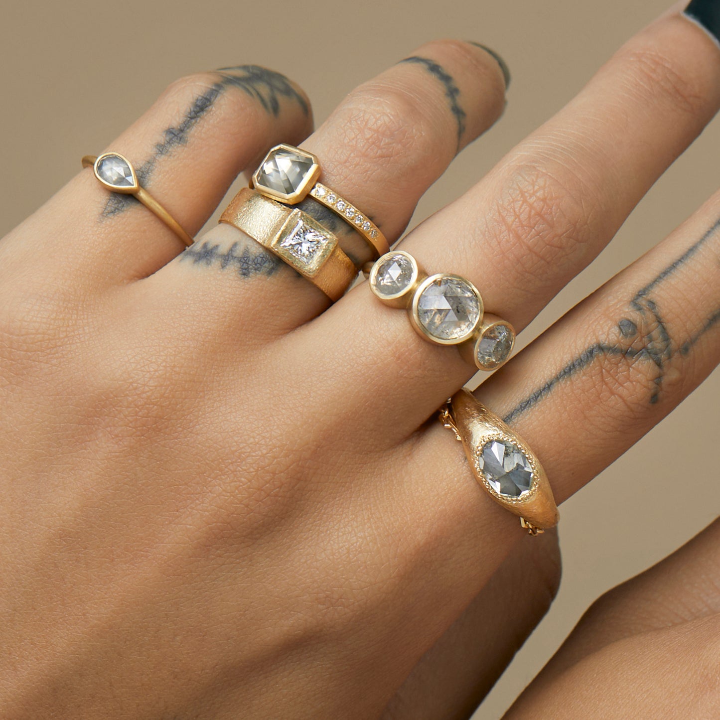 This 1.73 carat rose cut salt & pepper diamond ring showcases a unique salt & pepper effect, each stone meticulously chosen for its distinctive charm. Set in 18K yellow gold, the ring highlights the diamond's natural radiance, making it a striking statement of individuality.