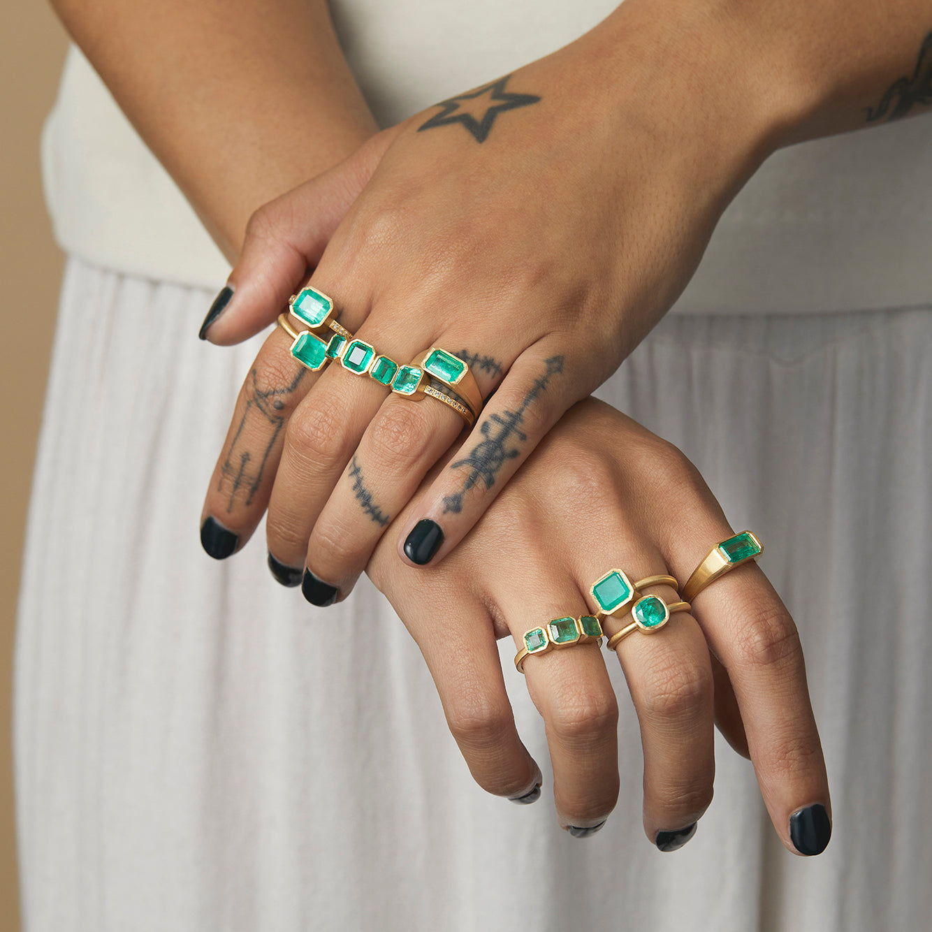 ["$2000 - $5000","1.0ct \u0026 Above","18K Yellow Gold","2 - 2.9mm","Emerald","engraving","Fashion bands with stones","Green","hide","Matte","May","One-of-a-Kind","Pastel Emerald Ring Collection","retail-only","Ring","shopify-pay-notice-exclude","Size 7 and above","upgraded-box"]