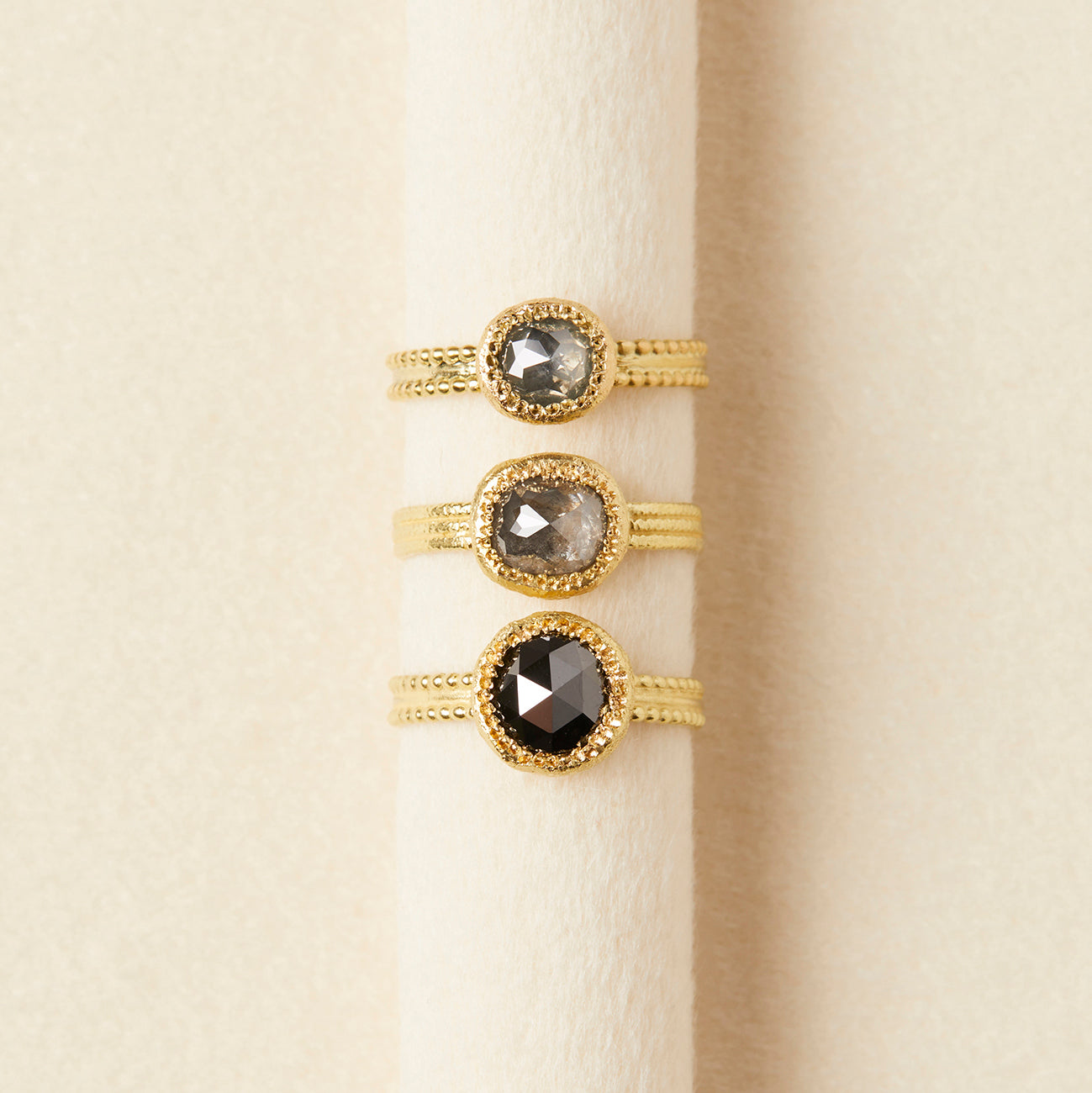 This year, we're celebrating the 10th anniversary of our Tribeca studio/showroom opening. Reflecting on those early days, Satomi has created a collection that incorporates plenty of textures and primitive touches, showcasing her distinctive style. Each piece carries subtle distortion and imperfection, enhancing its charm and evoking the warmth of the human hands that crafted them. The carefully selected oval and round rose cut diamonds, chosen for their individuality in cut, color, and shape, will captivate you. These unique rings will take your breath away!