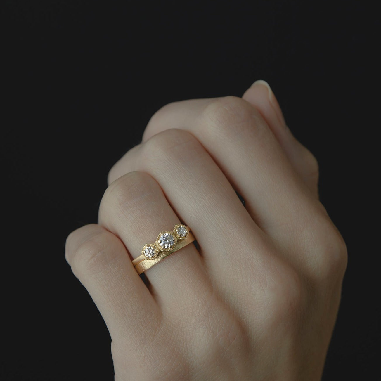 Hexagon diamond rings are unusual, which makes them all the more poetic and special. The three-stone configuration allows for extra sparkle and an elegant look inspired by antique jewelry.